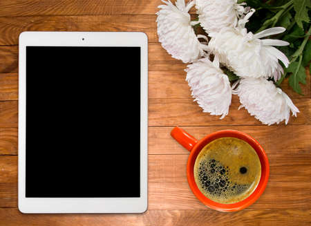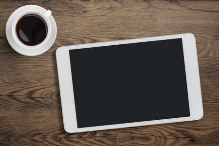 Tablet pc on table desk with coffee cup