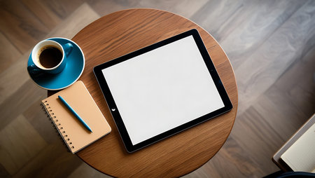 On a bright table is a tablet with a blank screen