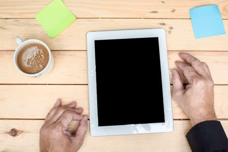 Businessman with tablet pc computer and coffee cup on wooden table