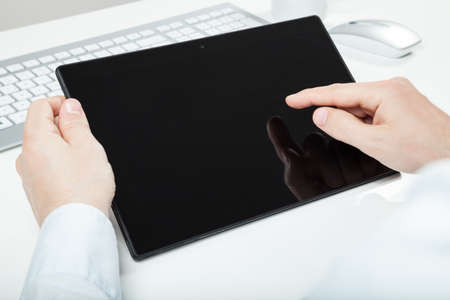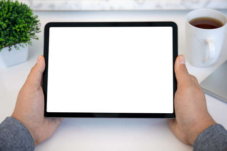 male hands holding computer tablet with isolated screen over table in office