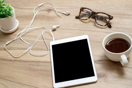 Top view workspace on wooden desk with tablet, earphones, glasses and a cup of coffee.