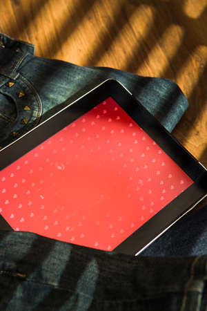 Tablet computer on blue wooden table
