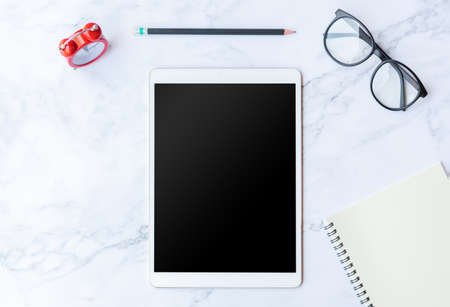 Vintage Tablet mockup flat lay on old white marble table top view background texture empty space concept above workspace office blank note, plan on business calendar, blogger idea