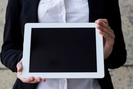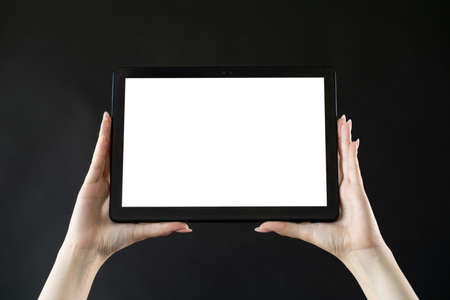 Mobile technology. Digital information. Advertising background. Female hands holding tablet computer with blank white screen isolated black.