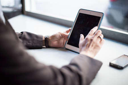 Close-up, Top view, Female in natural beige suit sitting in the coffee shop and using digital tablet. Tablet black screen mockup.