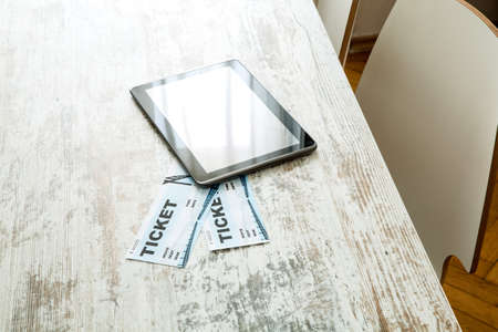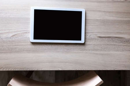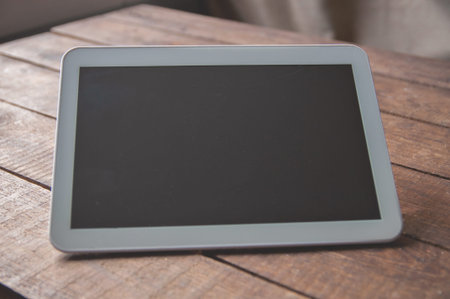 Tablet computer PC with blank screen mock up isolated on burned wood table background. Tablet on wood table. tablet white screen