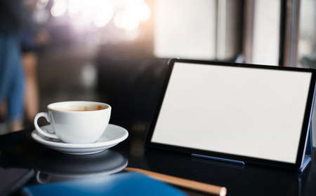 Focus on white coffe cup with blank screen of digital tablet on desk in cafe