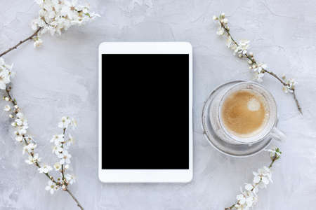 Digital tablet mock-up and spring white cherry blossom flowers and morning coffee cup. Online shopping, studying, sales mockup. Spring flat lay, top view, copy space. Internet application template