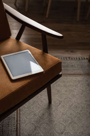 Blank screen tablet on vintage chair. Minimalist blog, website, app template. Copy space pad mockup.