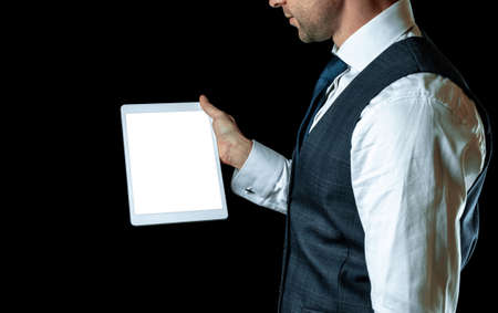Mockup device. Businessman holding mobile tablet blank screen. Smart technology device mock up isolated on black background. Game design, smartphone application presentation or portfolio mockups