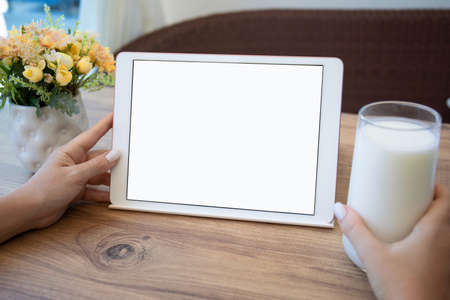 female hands hold white computer tablet with isolated screen on table with glass of milk in cafe