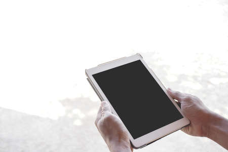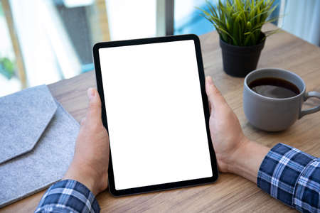 hand hold and use digital tablet white screen on workspace