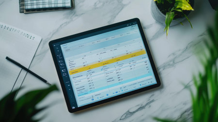 A sleek tablet shows detailed financial analytics and statistics on a marble desk, surrounded by plants and stationery, ideal for business and productivity themes.