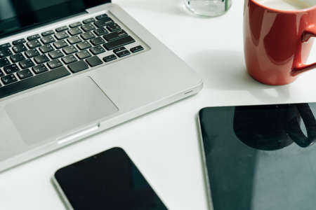 Top view - Minimal office desk with laptop computer and digital gadget.