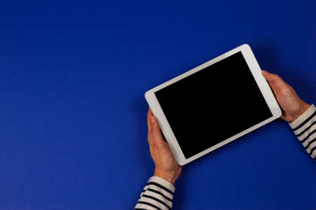 Female hands holding digital tablet computer on navy blue background. Top view