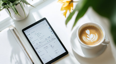 Close up of a digital tablet and a cup of coffee on a white table