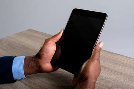 Close up of african american businessman holding digital tablet against grey background. business, professionalism and technology concept