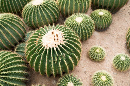 Large group of large cacti Echinocactus grusonii, Golden Barrel Cactus, Golden Ball Cactus