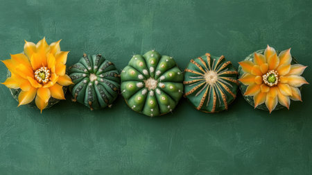 A vibrant assortment of cacti displaying yellow flowers on a textured green background, perfect for nature-inspired decor and botanical themes.