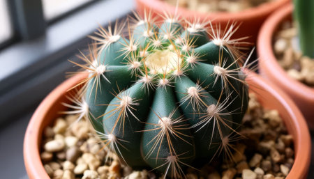 Close-up of a potted green cactus with sharp spikes. A captivating botanical portrait.