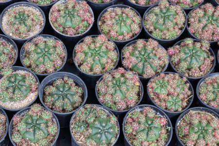 various types of succulent in flower pots in the greenhouse. Closeup, selective focus