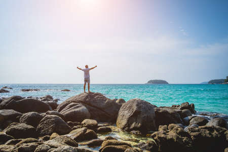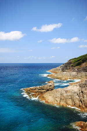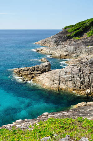 Phuket beach, rocks, sea and skies during the day with hot air.