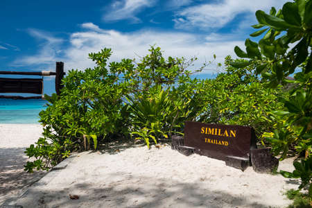 Similan island at banner checkpoint with white sand and beautiful turquoise sea and blue sky at summer, Phang Nga, Thailand. Famous travel destination. Holiday maker or vacation in tropical country.