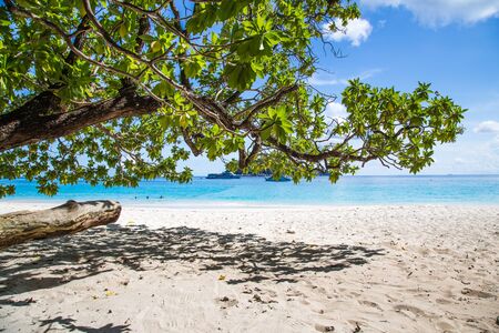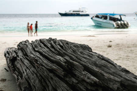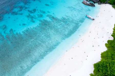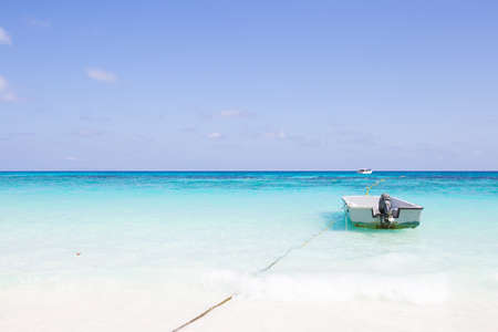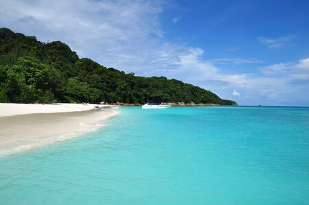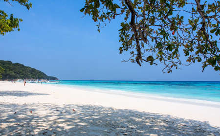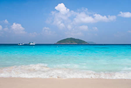 White sand beach on Tachai island with speedboat on background. Turquoise ocean