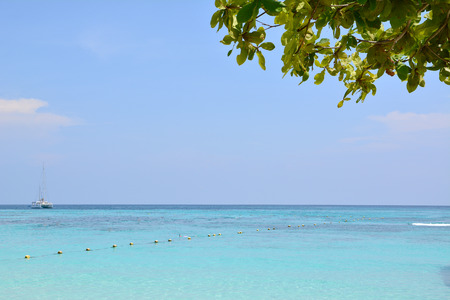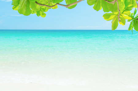 The waves of the sea surface are beautiful clean bright color sandy beach and white clouds the blue sky has a frame with green leaves summer nature at Samet Island Rayong Thailand. Holiday background