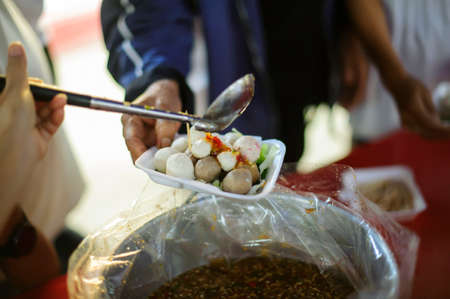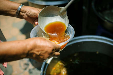 Hands of volunteers serves free food to the poor and needy in the city : The poor people bring a container to scoop food to eat and relieve hunger and bring home