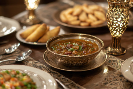 Iftar Feast: A Beautifully Styled Table Set with Traditional Dishes like Harira Soup, Samosas, and Dates, Bathed in Warm Lighting, Creating an Inviting Atmosphere for Ramadan Celeb