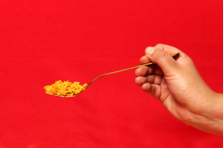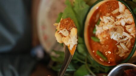 Thai food crab curry in spoon from East Thailand
