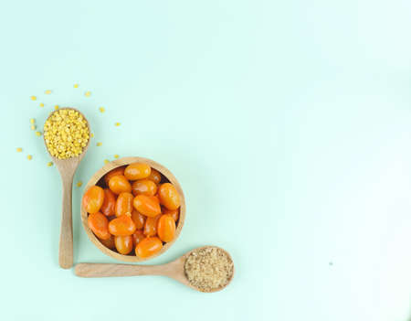 Top view of Thai dessert (Mung bean paste formed in egg yolk and sugar) and ingredient (hulled split mung beans, egg and sugar) on light blue background