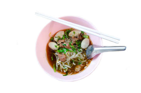 white noodle with porkball and black soup in Thai food style call KUAY TEAW