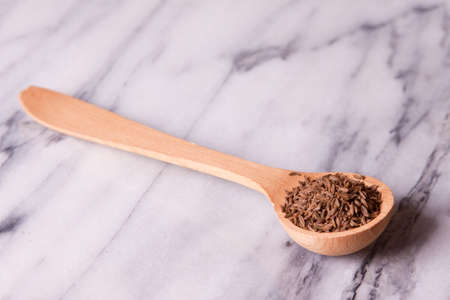 Caraway seeds in a wooden spoon on a marble background