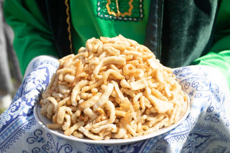 Traditional oriental sweets chuk chuk with honey on plate. National dish of Tatars