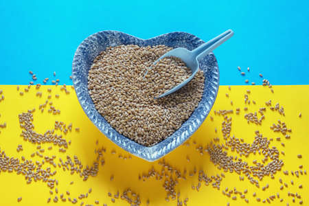 Wheat grains in a heart-shaped plate. Blue and yellow background in the colors of the Ukrainian flag. Copy space