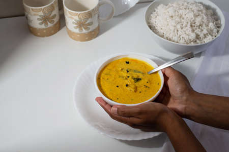 Serving delicious south Indian style mango curry with white rice, white background, hands