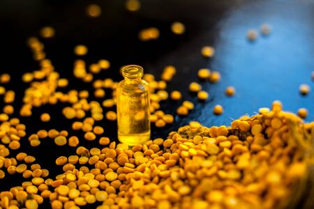 Shot of chickpea essence in a tiny glass bottle along with some raw yellow lentil with it on a wooden surface.