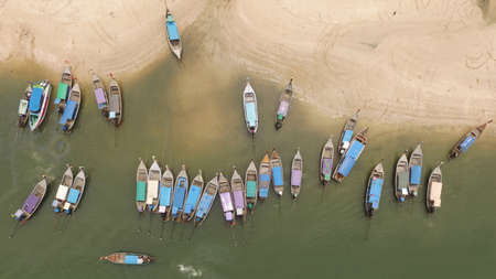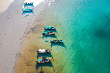 fisherman boat and Vintage wooden boat in sea. Boat drone photo..Aerial view of tropical island beach holiday yacht on blue reef ocean