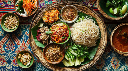 Discover a vibrant assortment of traditional Indian dishes beautifully presented on a woven platter, showcasing fresh ingredients and rich textures.