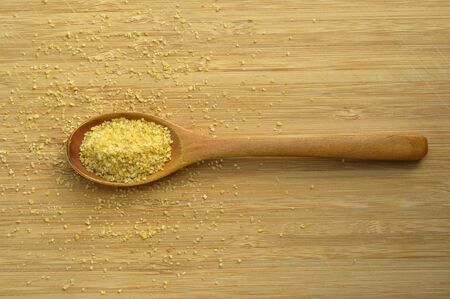 Dry cracked wheat daliya grains in wooden spoon, on bamboo cutting board