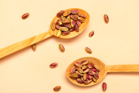 Spoons with tasty pistachio nuts on beige background