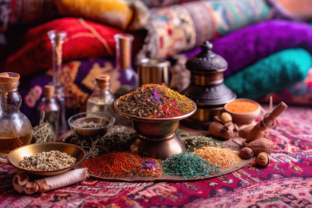 A table topped with bowls of different types of spices. Generative AI image.