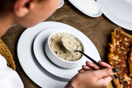 Customer eating Meatballs and Noodles soup and vegetable at street food market. Traditional delicious Indonesian food