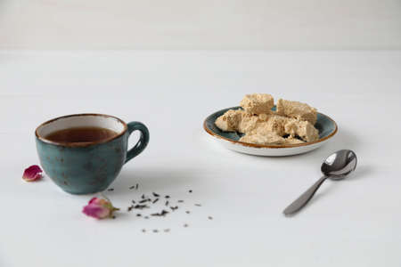 Peanut halva with tea in a cup