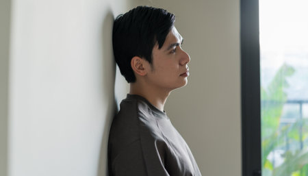 A young man stands against a neutral-colored wall, appearing deep in thought. Natural light filters in, creating a calm and reflective atmosphere in the modern space.
