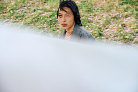 A young asian man showcases his denim fashion in a colorful park, radiating confidence and style.