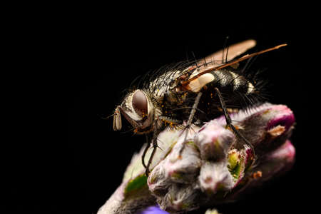 Macro Photography of Housefly on Flower Isolated on Black Background