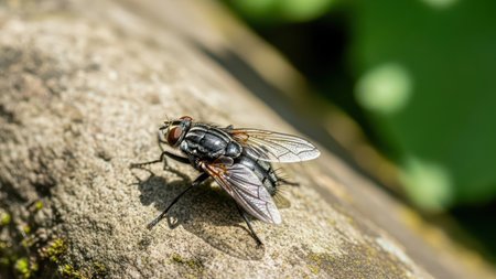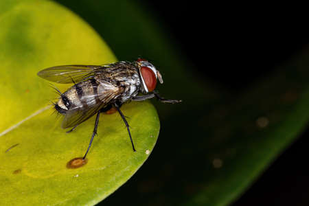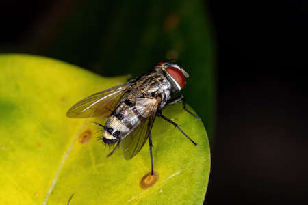 Close up details of large common fly sitting on green leaf with nature blurred background.
